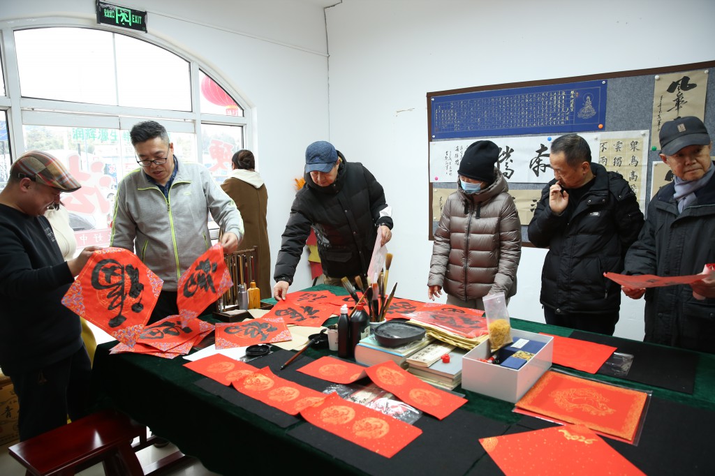 “听说您家刚添了孙子,我给您写个‘喜居宝地千年旺,福照家门万事兴’,再配个‘弄璋之喜’的横批如何?”孙老师温和地询问一位阿姨,这种贴心的个性化服务让现场业主倍感温暖。